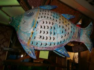 Blechfisch, Bunt mit Seitentür, Drehbar gelagert, mit Drehmotor, Fischgrösse ca 80 x 50 cm.
