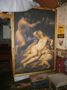 Position 17: Bild, Druck auf Stoff mit Rahmen, inkl. Getränkehalter, circa 141 x 205 cm. „Venus und Amor mit einem Satyr“ Antonio da Correggio, ca 1528.