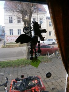 Position 63: Skulptur Tier, Papier, Collage, schwarze Tusche, ca 55 x 15 x 25 cm   Spende von: Atelier Iris Vitzthum Projektgelände Heile Welt Friedrich-von-Hagenow Str. 5 17493 Greifswald www.irvi.de