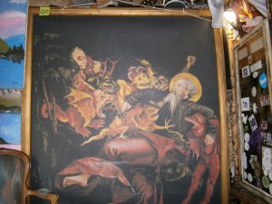 Position 20: Bild, Druck auf Stoff Mit Rahmen. "Die Versuchung des heiligen Antonius", ca. 155 x 178 cm.